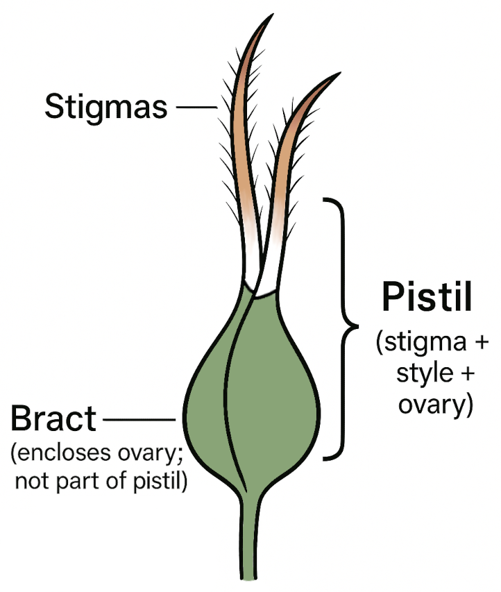 - Female: bract enclosing the ovary; pistil emerges from within as two long stigmas protruding through the top. The calyx membrane is microscopic in practice; what’s visible is the bract and part of the pistil.