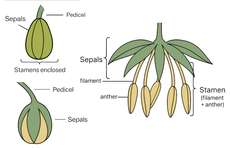 - When you see a closed, smooth bud on a pre-flowering plant, say fused sepals (immature male) rather than “pollen sac.”